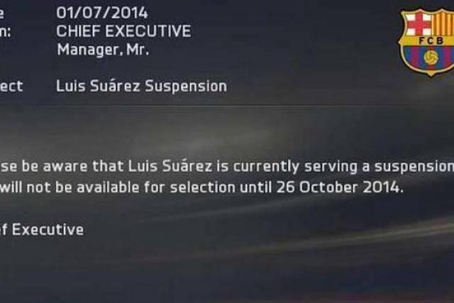 “Tenga en cuenta que Luis Suárez tiene una sanción pendiente y que no podrá estar disponible hasta el 26 de octubre”. Un mensaje que no ha acerca cada vez más la realidad a la pantalla de los videojuegos.