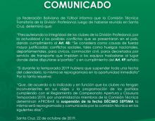No hay fútbol: la FBF decide suspender la fecha 17 que debía jugarse a mitad de semanaOctubre 22 Según el comunicado de la FBF, se decidió suspender la fecha para precautelar la seguridad de los clubes y los jugadores. |