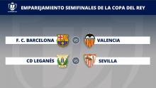 Valencia - Barcelona y Leganés - Sevilla, así quedaron las semifinales de la Copa del ReyEnero 26 La serie del Barcelona se definirá en Mestalla. Los encuentros de ida se disputarán el 31 de enero, mientras que los de vuelta se jugarán el 7 de... |