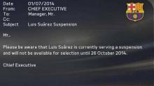 Luis Suárez, también sancionado en el FIFA 15Septiembre 25 Una imagen del FIFA 15 en la que se lee que Luis Suárez no puede jugar. |