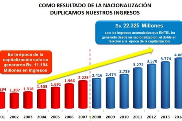 Entre 2013 y 2014, ENTEL también registró un significativo incremento; por ingresos en 2013 la nacionalizada generó 3.774 millones de bolivianos mientras que en 2014 se registró 4.080 millones de bolivianos, un incremento de 306 millones de bolivianos.