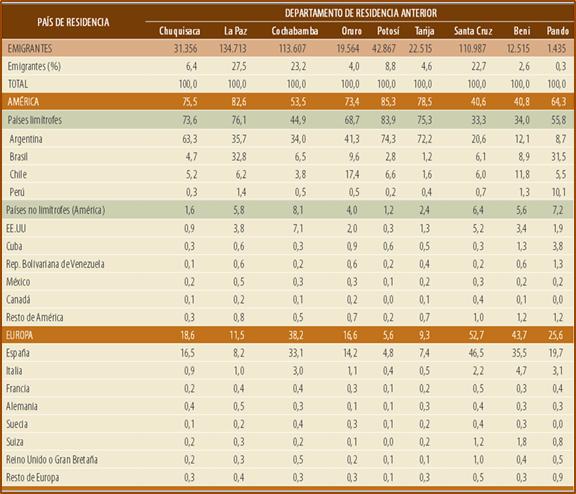 BOLIVIA: EMIGRANTES POR DEPARTAMENTO DE RESIDENCIA ANTERIOR, SEGÚN PRINCIPALES LUGARES DE DESTINO, CENSO 2012