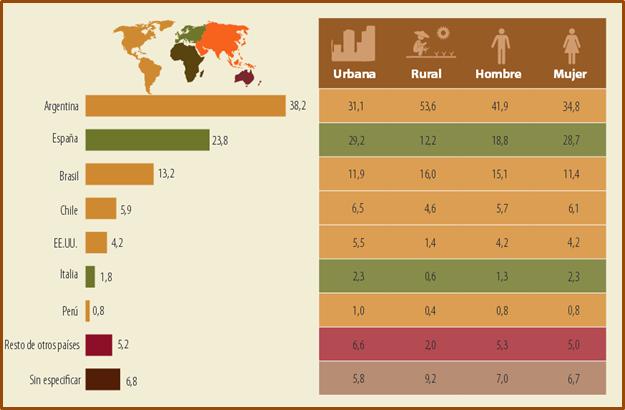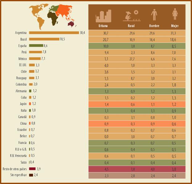 Los datos censales también mostraron que España se constituye en el país con mayor afluencia para las mujeres emigrantes con 28,7%.