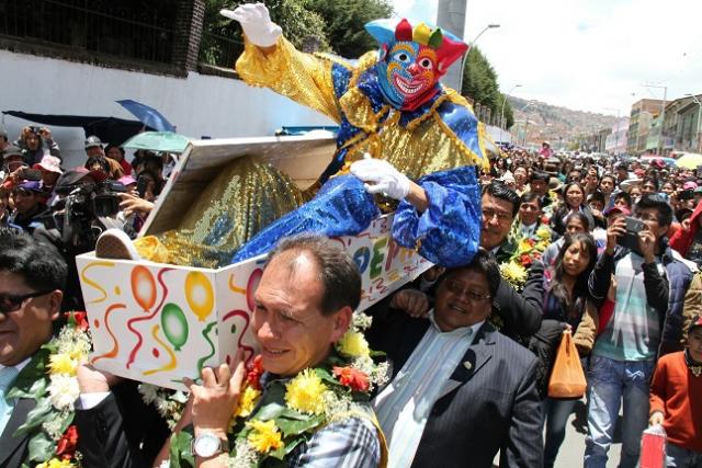 El maestro de ceremonias gritó emocionado, las bandas empezaron a tocar música chuta y la alegría se apoderó de la multitud. De un brinco, el Pepino salió del ataúd. Hiperactivo bajó de la tarima, hizo girar su “matasuegras” lila y fucsia mientras mandaba besos a las mujeres. El secretario Municipal de Cultura, Andrés Zaratti, logró tranquilizarlo cuando le entregó una llave simbólica de la ciudad de La Paz hecha de cartón.