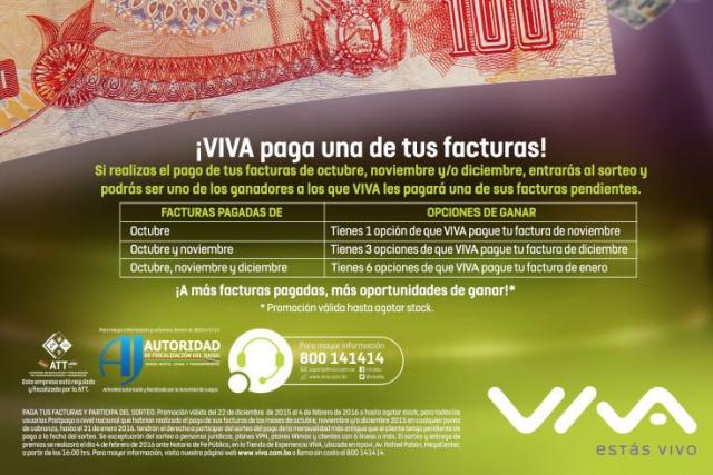 La Paz, 15 de enero (Oxígeno).- “Paga tus facturas y participa del sorteo de pago de mensualidades gratis" es el slogan de la campaña impulsada por VIVA que busca recompensar con el pago de una mensualidad a los clientes Postpago que realicen el pago puntual de sus facturas de los meses de octubre, noviembre y/o diciembre hasta el 31 de enero.