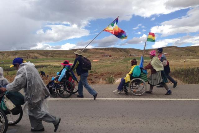 La caravana de las personas con discapacidad que se dirige hacia la ciudad de La Paz en demanda del bono de 500 bolivianos mensuales decidió permanecer en Ayo Ayo debido a las fuertes lluvias que azotan la región y les impiden continuar con el recorrido.