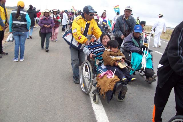 La cara roja por el frío, sus ojitos vivaces y cabello de color negro y largo, porque no fue al peluquero hace un mes, su sonrisa tierna e inocente y el pedido insistente “Yenta” del pequeño Luis, de tres años le da fuerzas suficientes para continuar a Emilia, su mamá que está postrada en una silla de ruedas y participa en la caravana de las personas con discapacidad en demanda del bono de 500 bolivianos mensuales.