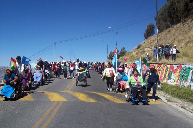 Una vez en la avenida Kollasuyo, la caravana tuvo dificultades para descender debido a la vía empinada y con baches por doquier que impedían que las personas en sillas de ruedas puedan avanzar con normalidad y las personas encargadas de empujarlos tuvieron que redoblar sus esfuerzos para evitar que ocurra un accidente.