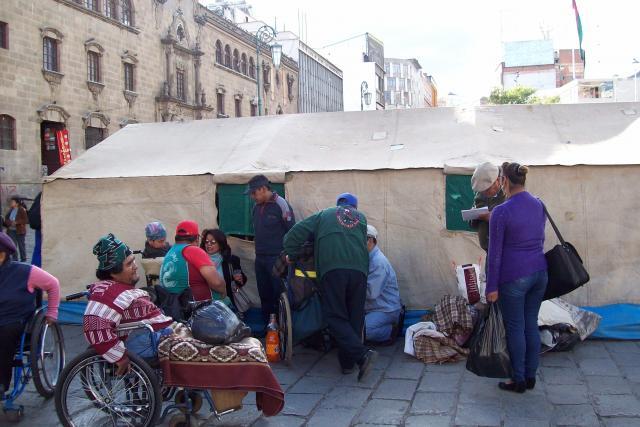 Las personas con discapacidad rechazaron la invitación del Gobierno, y también rechazaron los acuerdos y confirmaron la demanda de un bono mensual de Bs 500. Mantienen la vigilia en la calle Indaburo y escribieron carteles con sangre rechazando la solicitud de dialogo.