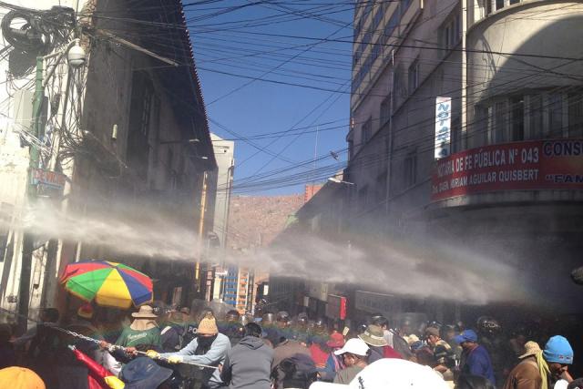 El carro Neptuno lanza un chorro de agua a los movilizados. Foto: Violeta Ayala