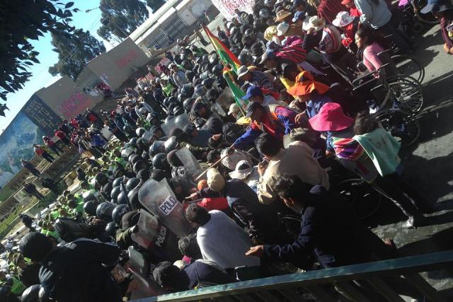 Desde tempranas horas de hoy, la caravana de las personas con discapacidad llegó hasta la Cruz Papal de la ciudad de El Alto con el objetivo marchar hacia la urbe paceña en demanda de la renta de 500 bolivianos, pero la movilización se vio frustrada, ya que al llegar a la Ceja un contingente policial impidió su paso y se produjo un enfrentamiento.