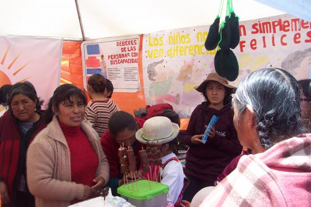 Este puesto tenía dos objetivos, por un lado las socias vendías sus artesanías de cerámica y textil, que también venden en las Alasita. Pero, por otro, compartían información sobre posibilidad de sustento, salud, rehabilitación y fortalecimiento del programa RBC.
