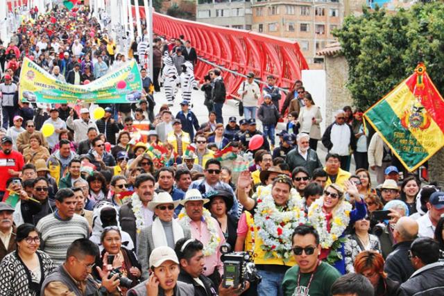En medio de la alegría de la gente, Revilla, junto a algunos concejales, dirigentes vecinales y población en general recorrió el puente hacia Sopocachi donde se armó un escenario para el acto central.