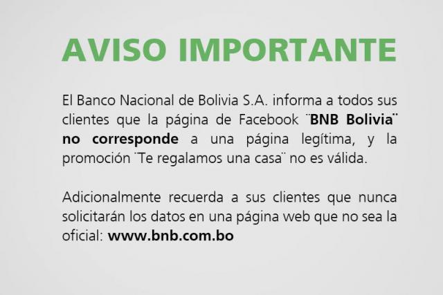 El Banco Nacional de Bolivia informó a todos sus clientes que la página de Facebook “BNB Bolivia” no corresponde a una página legítima y que la promoción “Te regalamos una casa” no es válida.