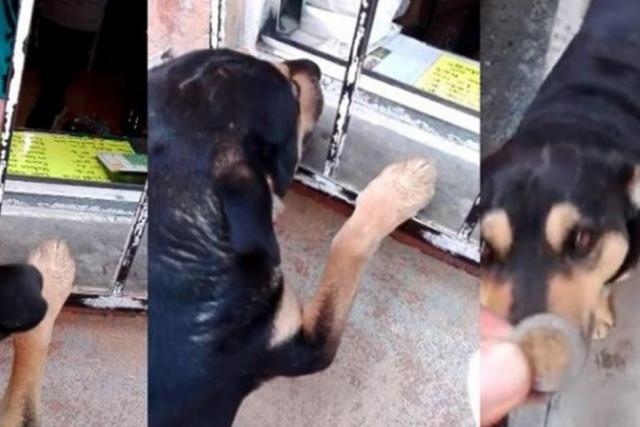 Cabrón’ pide una moneda para intercambiarla por una salchicha en un negocio mexicano, que no duda en alimentar el tierno animal.