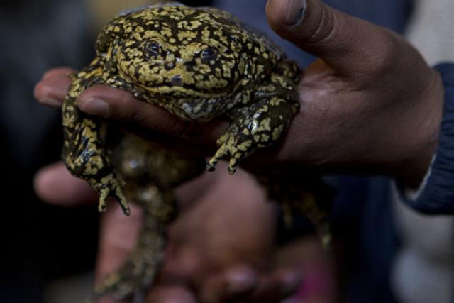 Rescatan en El Alto a cría de rana gigante del Titicaca, especie en peligro de extinción