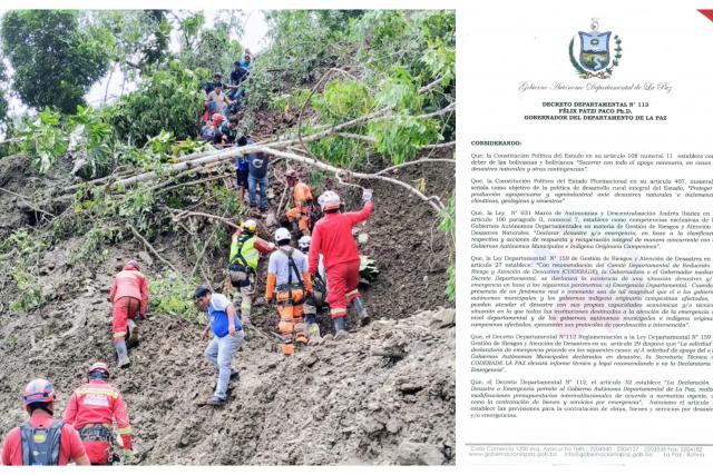 “Se decreta declarar emergencia y desastre departamental, por los efectos de las variaciones climáticas que están ocasionando inundaciones, desborde de ríos, heladas, deslizamientos, derrumbes, vientos fuertes, y granizadas que se vienen suscitando en el Departamento de La Paz”, señala el mencionado decreto.
