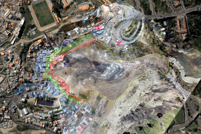 “La franja roja es donde 19 viviendas tienen que ser demolidas para estabilizar el área. La franja verde todavía está en evaluación de demolición, es posible que no haya necesidad de demolición por lo tanto puedan (las personas) volver sus casas, lo mismo que la franja azul que está más atrás, donde hay 53 viviendas que están bajo monitoreo. (Son) 53 viviendas desalojadas preventivamente, pero en función a los trabajos y evaluación es posible que puedan volver a estas viviendas”, dijo el Alcalde.