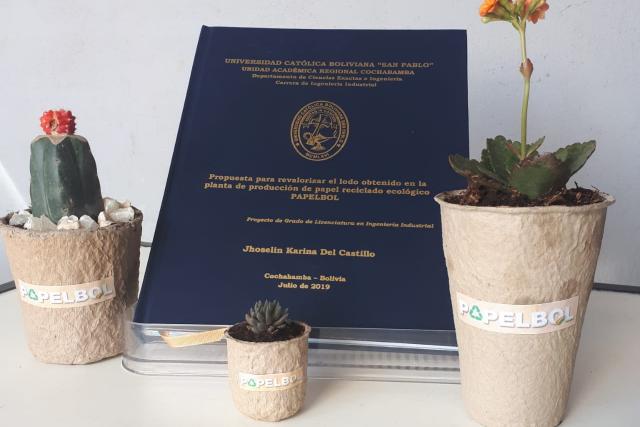 Jhoselin Karina del Castillo, una universitaria de la Carrera de Ingeniería Industrial de la Universidad Católica Boliviana “San Pablo”, Cochabamba, realizó un Proyecto de Grado en la Empresa Pública Productiva Papeles de Bolivia (Papelbol) para rescatar el lodo residual que genera el tratamiento de las aguas residuales y fabricar macetas ecológicas.
