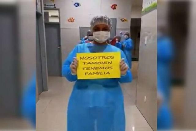 “Nosotros también tenemos familia”, se lee en el primer cartel que sostiene una trabajadora del centro médico. Exhortando así a la población a que sigan cumpliendo con las normas con el fin de no seguir contagiándose del coronavirus.