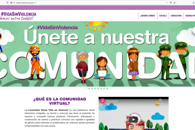La plataforma Comunidad Virtual Vida Sin Violencia será el espacio para compartir herramientas y fomentar la réplica de buenas prácticas a quienes, desde la función pública o el compromiso personal, trabajan para prevenir y mejorar los servicios de atención a mujeres en situación de violencia. Este nuevo servicio será lanzado el próximo lunes 21 de septiembre, por la señora embajadora de Suiza en Bolivia, Dra. Ph. Edita Vokral.