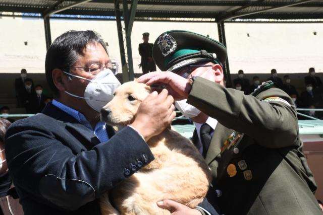En el mismo acto, desarrollado en la Academia Nacional de Policías (Anapol), el presidente del Estado, Luis Arce, rindió homenaje a perros policías en conmemoración del Día de San Roque.
