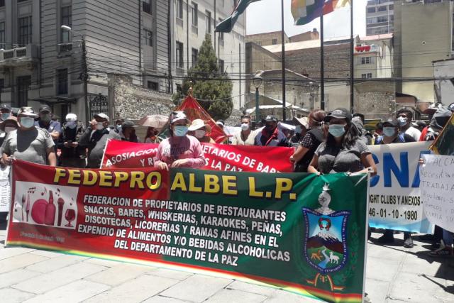 Un grupo de propietarios y trabajadores de las discotecas, bares y centros nocturnos, protagonizó una protesta frente a la Alcaldía de La Paz y sus dirigentes explicaron que se ven afectados por las restricciones y tiene empleados a los cuales deben cancelar, deudas al banco que pagar.