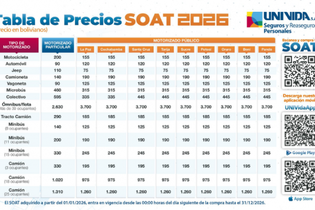 Univida publica precios del SOAT 2026 y mantiene cobertura de Bs 24.000 en gastos médicos