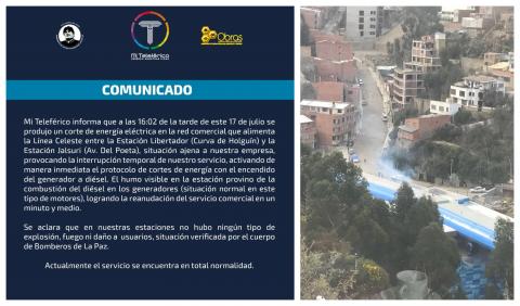 Mi Teleférico aclaró que la Línea Celeste – entre la Estación Libertador (Curva de Holguín) y la Estación Jalsuri (Av. Del Poeta)- sufrió un corte de energía eléctrica. En estos momentos, el funcionamiento del transporte por cable es normal.
