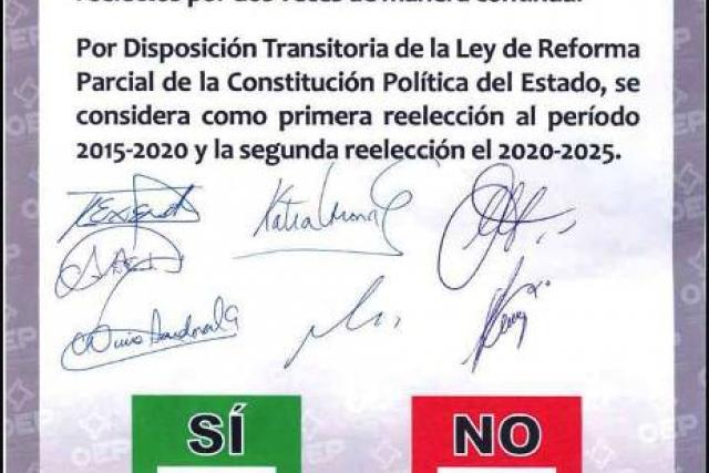 La consulta es complementada con el siguiente texto: “Por disposición transitoria de la Ley de Reforma Parcial a la Constitución Política del Estado, se considera como primera reelección el periodo 2015-2020 y la segunda reelección el 2020-2025”.