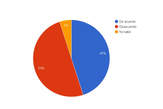 Los datos totales dan a conocer que el 45% eligió las opciones “Muy de acuerdo” y “De acuerdo”; el 50%, las opciones “En desacuerdo” y “Muy en Desacuerdo”; y el 5%, “No sabe”.