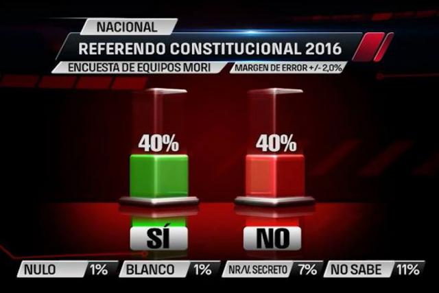 La Paz, 11 de febrero (Oxígeno).- A diez días del referéndum constitucional del 21 de febrero, una encuesta de Equipos Mori para la red Unitel refleja un empate técnico entre las opciones del SI (40 %) y el No (40%). Según la intención de voto, un 11% no sabe aún por qué opción votar y un 7% voto secreto.