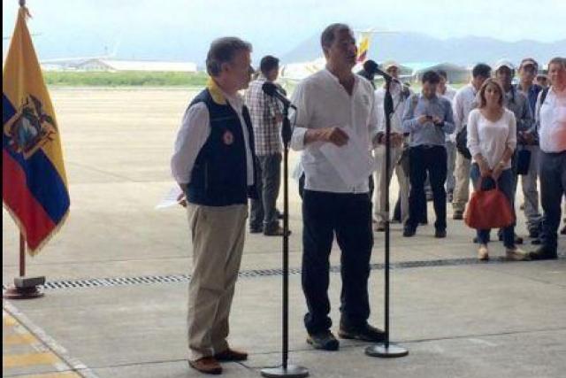 El presidente colombiano, Juan Manuel Santos, llegó la mañana de este domingo a la Base Aérea de Manta para entregar más de 23 toneladas de ayuda humanitaria para los damnificados y se espera que otras cuatro toneladas de víveres y 65 mil galones de agua lleguen en barco.