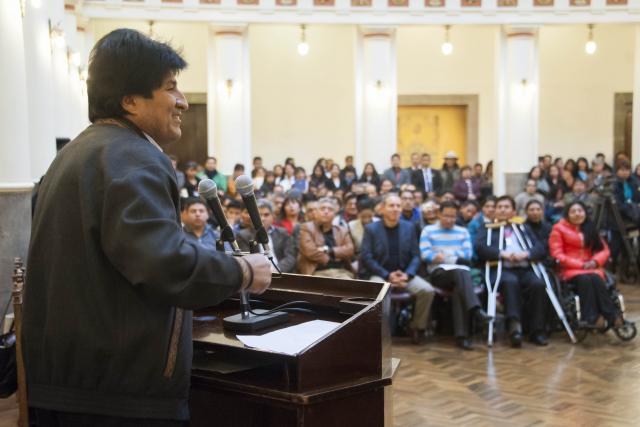 El presidente Morales acudió al acto y entregó los memorándums de designación, reconoció que aún quedan muchas demandas que atender para el sector de personas con discapacidad; pero les recordó que la subvención que recibían los partidos políticos (40 millones de bolivianos) se destina a proyectos que los benefician directamente.