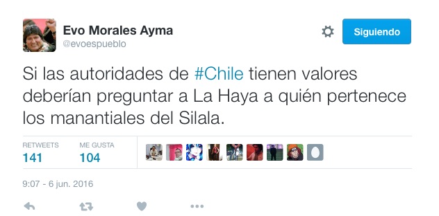 Ante el anuncio de Chile de demandar a Bolivia por las aguas del Silala, el presidente Evo Morales respondió, a través de su cuenta en twitter, que el país vecino debería preguntar a la Corte Internacional de Justicia (CIJ) de La Haya, a quién pertenece los manantiales del Silala.