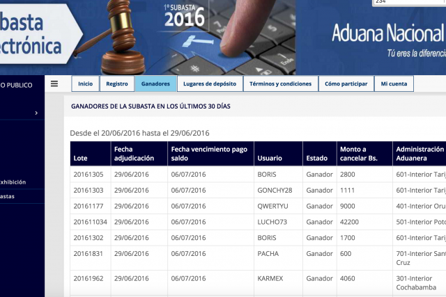 A las 20:00 de ayer se terminó la subasta por internet de 120 lotes de productos que se encuentran en almacenes de la Aduana. Según el reporte inicial de la página web de la aduana, se logro recaudar 2.498.081 bolivianos. Fue un proceso novedoso que atrajo una multitud de interesados, tantos que la aplicación colapsó en algunos momentos.