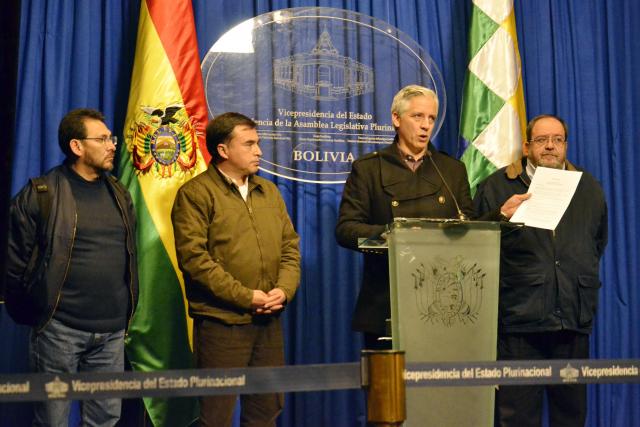 El vicepresidente García Linera explicó en conferencia de prensa: ”Desde días atrás y el sábado y domingo nos hemos reunido con la dirigencia de la COB para tratar el tema de Enatex y logramos buenos acuerdos que serán perfeccionados para seguir avanzando hasta la solución definitiva”.