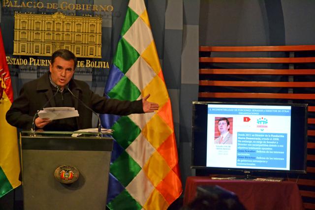El ministro de la Presidencia, Juan Ramón Quintana, convocó a una conferencia de prensa para exponer el resultado de la investigación que realizó sobre el Senador de Unidad Demócrata, Oscar Ortiz. El ministro lo acusó de cometer tres delitos y lo emplazó a informar sobre la procedencia de sus recursos. El senador Ortiz le respondió que presidir una Fundación es un derecho constitucional y que los recursos no los recibe de forma personal.