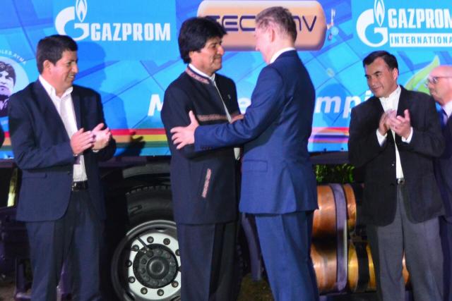 El director ejecutivo de la empresa rusa Gazprom, Alexéi Miller, entregó al presidente Morales un camión ruso de la marca Kamaz durante su visita a Bolivia. Se trata de un vehículo amable con el medio ambiente, por lo que el ministro de Hidrocarburos destacó el propósito de cambiar la matriz energética para bajar las emisiones de carbono.