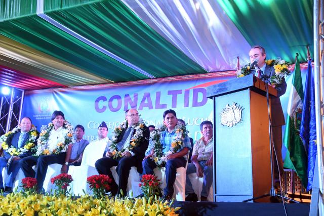 León de la Torre Krais, embajador en Bolivia de la UE, participó en la inauguración y resaltó que el Gobierno cumple con los compromisos internacionales en relación al control de narcotráfico; y reafirmó “el apoyo de la Unión Europea en el marco de la responsabilidad compartida a la lucha contra las drogas, que Bolivia lleva adelante en respeto de sus compromisos internacionales”.