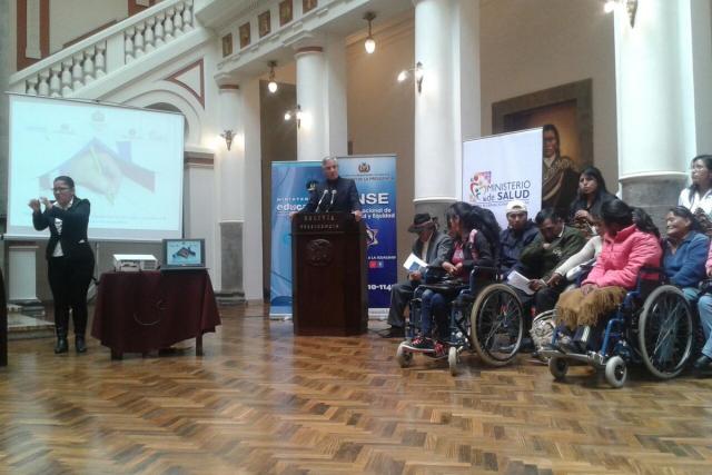 El vicepresidente García Linera presentó el proyecto socio comunitario de "educación en casa” que beneficiará a 90 niños y adolescentes con discapacidad grave y muy grave en los 9 departamentos. Los ministros de Educación, Salud y Justicia participan en este proyecto, durante el acto el ministro Quintana aseguró que por instrucción del vicepresidente se otorgará a los estudiantes el servicio de internet gratuito.