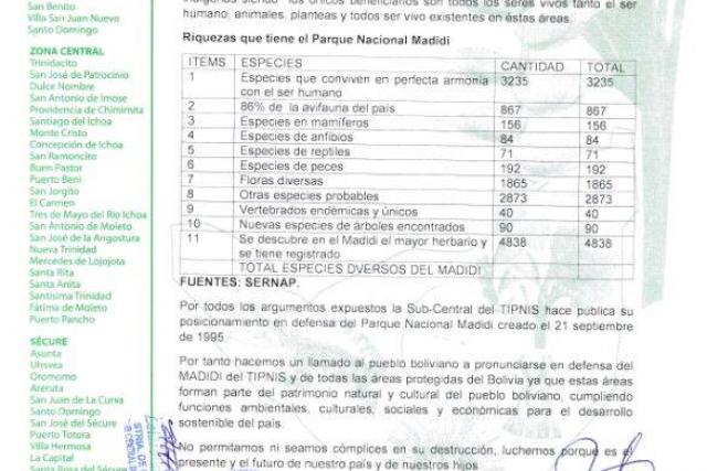 La Subcentral TIPNIS “hace pública (sic) su posicionamiento en defensa del Parque Nacional Madidi… hacemos un llamado al pueblo boliviano a pronunciarse en defensa del MADIDI y TIPNIS y de todas las áreas protegida de Bolivia ya que éstas forman una parte del patrimonio natural y cultural del pueblo boliviano” dice el pronunciamiento firmado por Fernando Vargas y Raquel Hoyo.