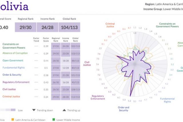 Bolivia en el lugar 104 de 113 en cuanto a gobierno de la ley