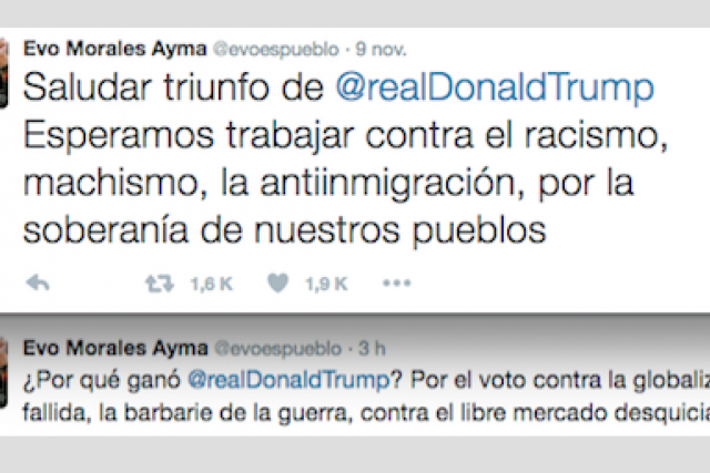 Sobre las políticas que anunció Trump, Morales dijo que si es proteccionista “que deje de intervenir paises”, que si desea hacer respetar la soberanía de su país, “que respite la soberanía de todo el mundo”, que si está contra la globalización que no “levanter decretos supremos como el de Obama que planificaba la intervención a Venezuela”. Además habló sobre que las nuevas generaciones de ese país no creen en la globalización, en el libre Mercado ni en el intervencionismo de Estados Unidos.