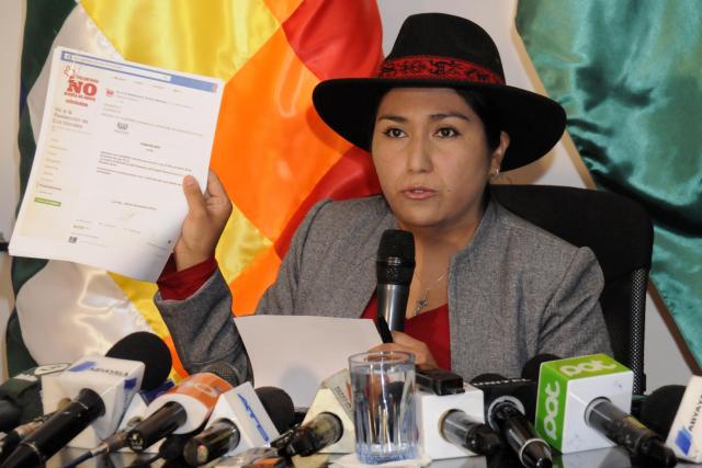 La ministra de Comunicación, Marianela Paco, convocó a una conferencia de prensa en la que mostró publicaciones del día de inocentes; desmintió la información y denunció que se trata de un ataque sistemático de la oposición contra el Presidente Morales. Anunció que iniciará procesos legales para sentar un precedente.
