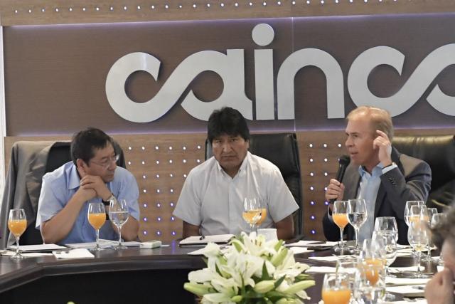 El presidente Morales junto al ministro Arce y el presidente de la Cainco, Jorge Arias Lazcano. Foto: ABI
