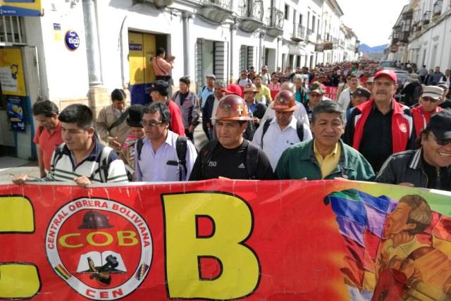 Con un marcha por las calles de Sucre, que terminó en un mitín frente al Tribunal Constitucional Plurinacional (TCP), la Central Obrera Boliviana (COB) dio fin a su ampliado nacional. Las determinaciones son rechazar y declararse en estado de emergencia ante el convenio firmado con el sector agrario para otorgar préstamos con los fondos de jubilación; iniciar un juicio de responsabilidades contra los magistrados que restituyeron los preavisos y demandar la institucionalización de la Caja Nacional de Salud (CNS).