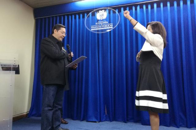 Lenny Valdivia es la nueva directora de la ASFI, Gonzalo Trigoso es viceministro de Transparencia y Hugo Siles es viceministro de Autonomías.