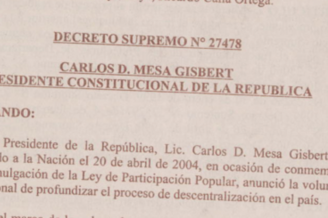 "Que el Presidente de la República, Lic. Carlos D. Mesa Gisbert, en su Mensaje dirigido a la Nación el 20 de abril de 2004, en ocasión de conmemorar 10 años de la promulgación de la Ley de Participación Popular, anunció la voluntad del Gobierno Nacional de profundizar el proceso de descentralización en el país."