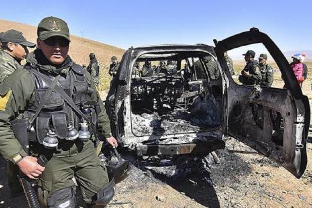 Así quedó el auto en el que se transportaba Illanes, después que fuera quemado por los cooperativistas.